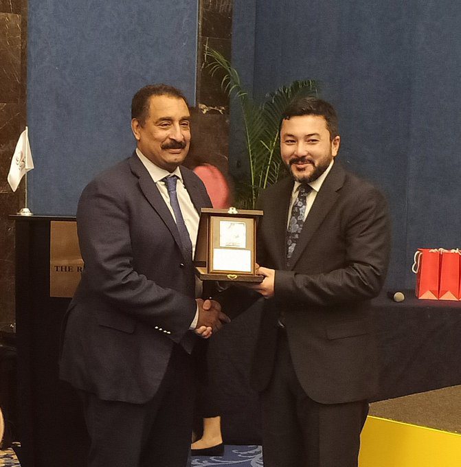 A photo of H.E. Mr. Taha Ayhan, President of Islamic Cooperation Youth Forum while handing gifts to today’s speakers and moderator at Young Business Hub Summit #YBH